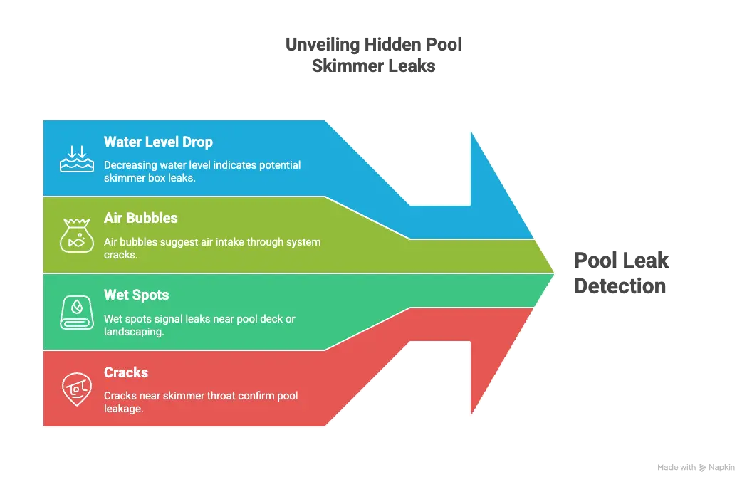 A skimmer is built into the pool shell, collecting surface pool water before it flows through the filter system. Over time, the connection between the skimmer and the concrete can shift, crack, or weaken due to soil movement beneath the pool deck.